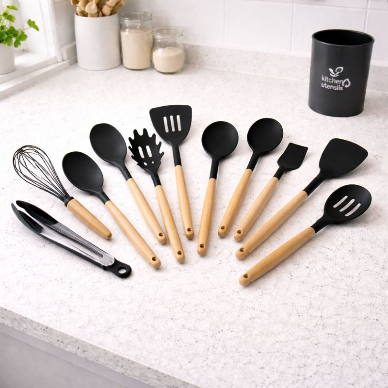 Make meal prep effortless with the Chefiora™ Silicone Kitchenware Utensils Set. This all-in-one collection equips you with essential tools for cooking, baking, stirring, and serving with ease. Crafted from premium, heat-resistant, food-grade silicone, each utensil is gentle on non-stick cookware while delivering durability you can rely on. Designed for comfort and efficiency, the ergonomic handles provide a secure grip for precise control in the kitchen. Say goodbye to scratched pans and flimsy tools, and enjoy smooth, mess-free cooking every time. Easy to clean, stylish, and built for everyday use, this utensil set is the perfect foundation for fast, stress-free, and flavorful meals.